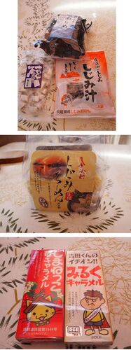 食品あれこれ 他にもいろいろ買った気がするけど お土産で渡しちゃったものには写真が無い~。 吉田くんクッキー 島根の自虐ギャグシリーズ。 でも、ステキな所でしたよ、島根県! 玉造温泉水 (使用期限5日だけど。。。。) 最近、こういうダジャレものが…