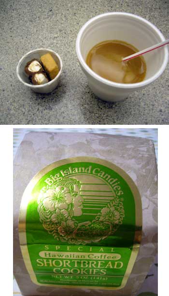 お店に入ると、まずは試食のクッキーとコナコーヒーを頂けます。